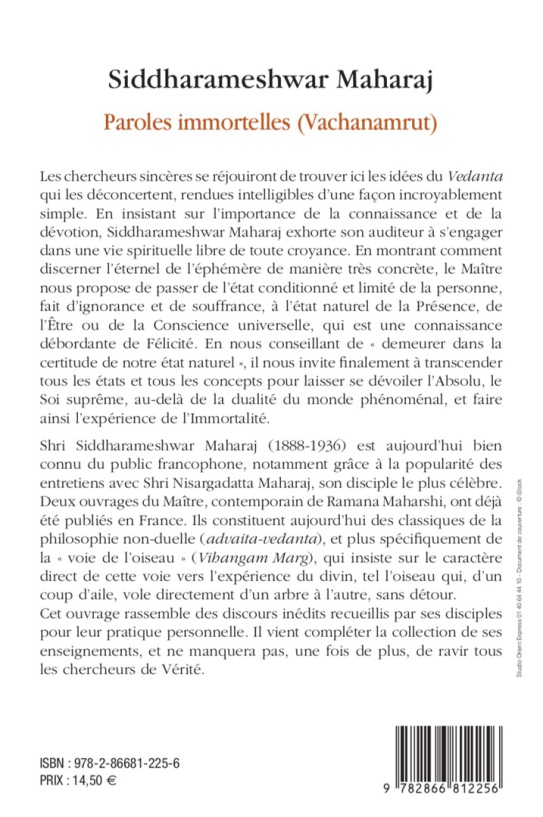 "L’enseignement de Siddharameshwar, qui appartient notamment à une lignée remontant à Dattatreya, s’inscrit dans la tradition de l’advaita-vedanta, une philosophie non-duelle, et est connue, comme voie directe, sous l’expression de « voie de l’oiseau ». (…) Ce livre est composé de discours inédits recueillis par des disciples (...) Acquérir la connaissance, laisser les désirs s’élever vers le Soi, voir la non-pensée dans les pensées, prendre conscience de sa véritable Nature, absolument libre… Tels sont quelques-uns des regards proposés par Siddharameshwar."